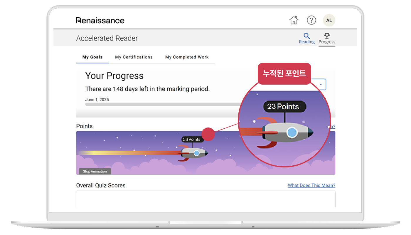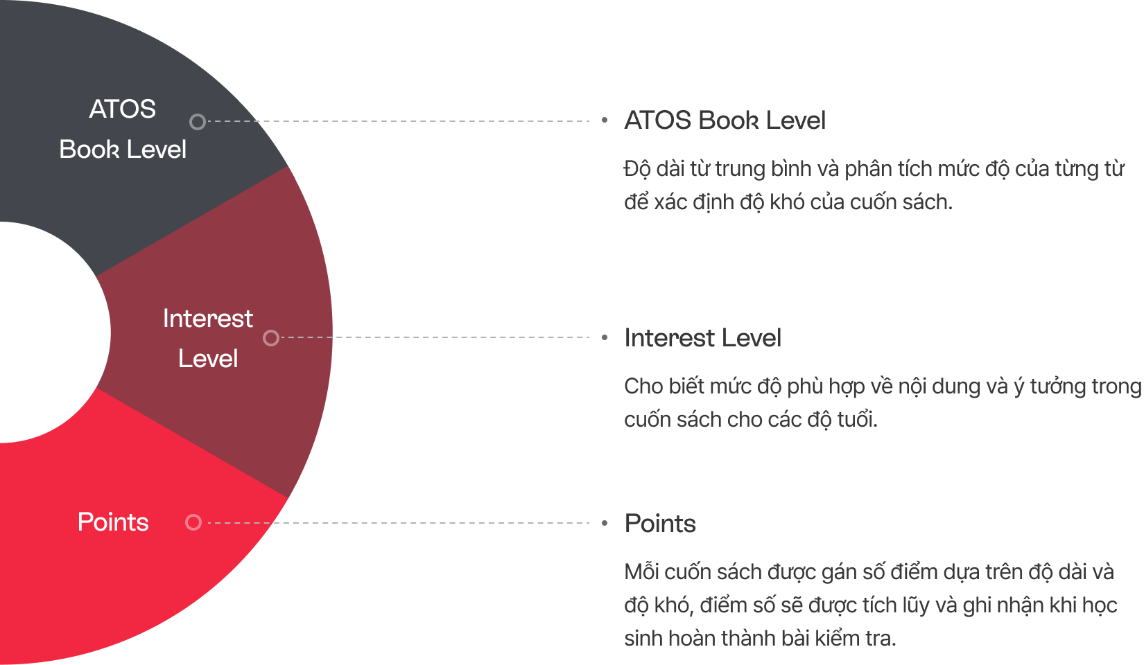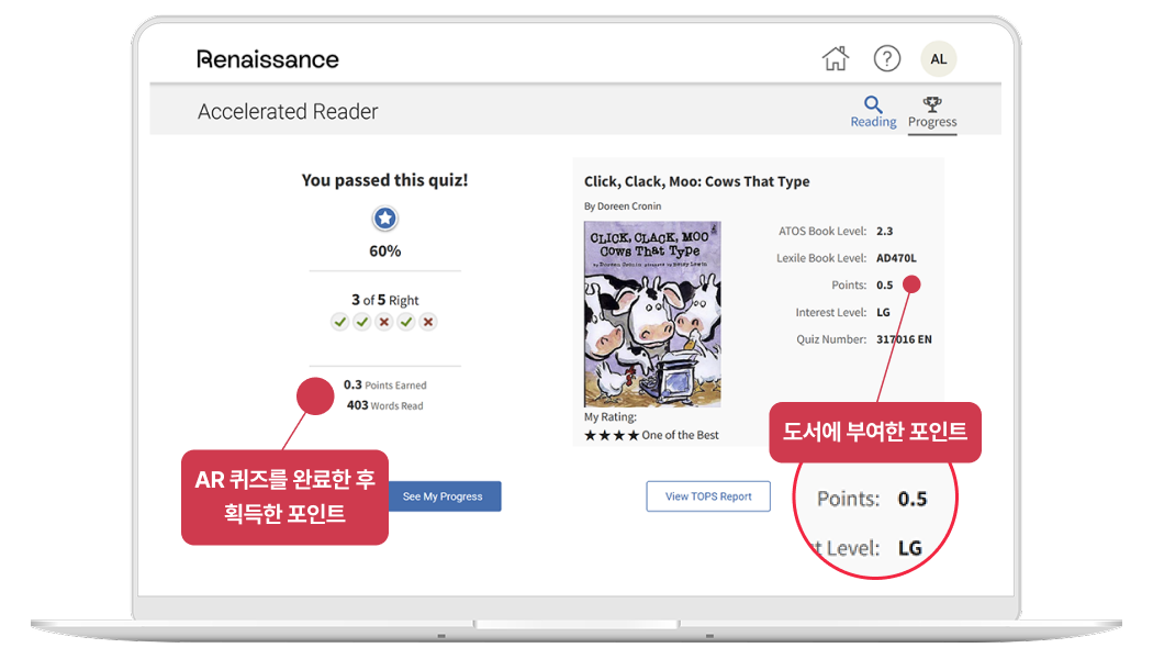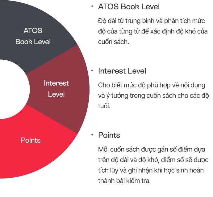 "Tất cả các cuốn sách có kèm bài kiểm tra AR đều được quy đổi thành điểm dựa trên độ dài và độ khó của sách. Học sinh sẽ nhận được điểm tương ứng với tỷ lệ trả lời đúng trong bài kiểm tra, từ đó tạo động lực để tiếp tục tham gia các hoạt động đọc. Điểm số được tích lũy theo thời gian và có thể được sử dụng để theo dõi, quản lý hoạt động đọc của học sinh. "