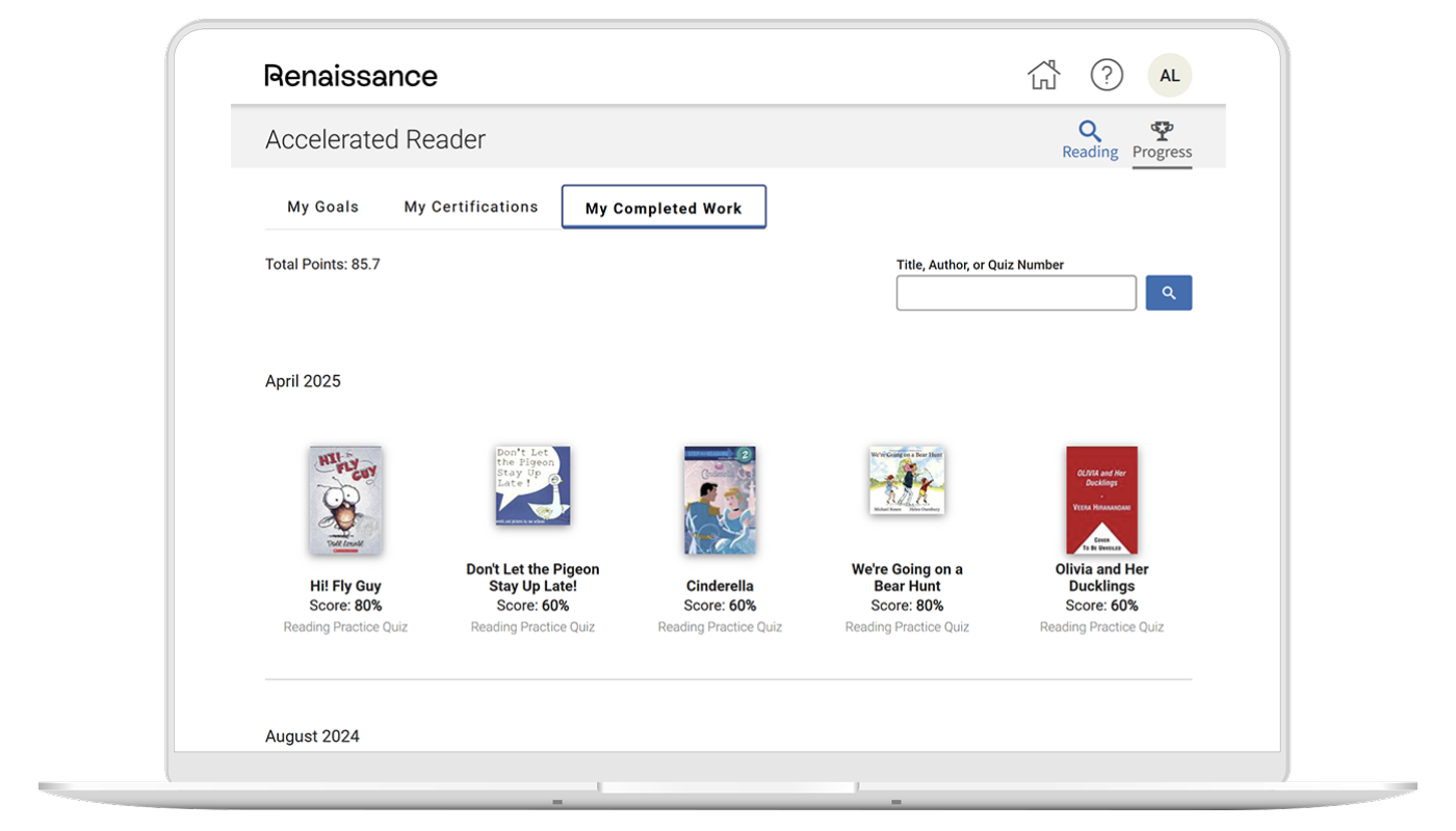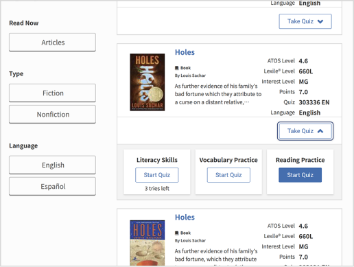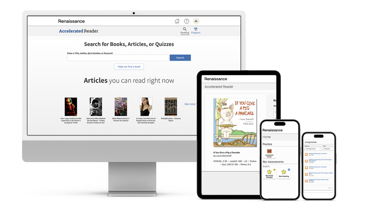 Accelerated Reader (AR) cung cấp hơn 220.000 bài kiểm tra theo sách, hỗ trợ cả trẻ em bản ngữ nói tiếng Anh và người học tiếng Anh trên toàn thế giới trong việc đánh giá mức độ hiểu nội dung sách tiếng Anh. Thông qua các bài kiểm tra chất lượng cao do đội ngũ nghiên cứu chuyên môn tại trụ sở Renaissance Learning xây dựng và tuyển chọn, học sinh có thể phát triển kỹ năng phân tích, tư duy và hình thành thói quen đọc tiếng Anh hiệu quả.